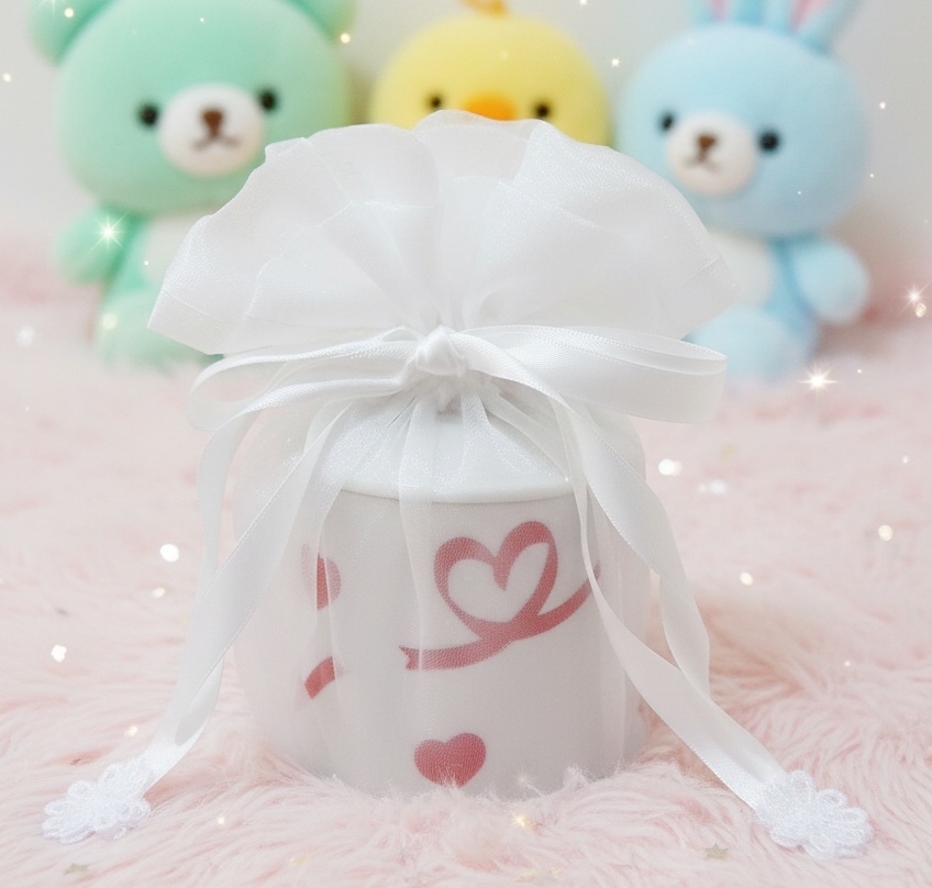 白いリボンを結ぶと、ふんわりとした優しい雰囲気が漂います。