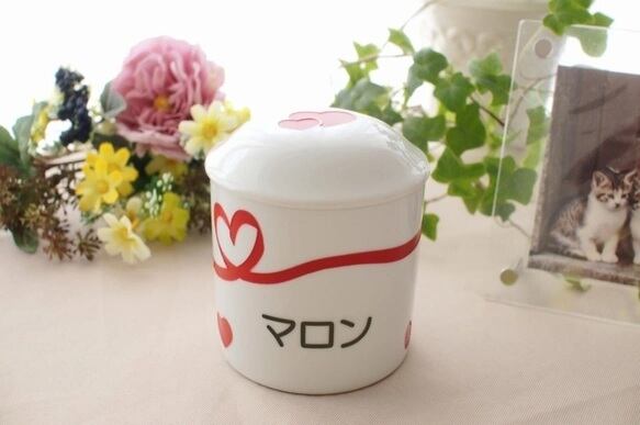「ハート&リボン柄ポット」は、おやつや首輪、お手入れ用品、お気に入りのおもちゃなどを入れるのにぴったりな陶器のポットです。
