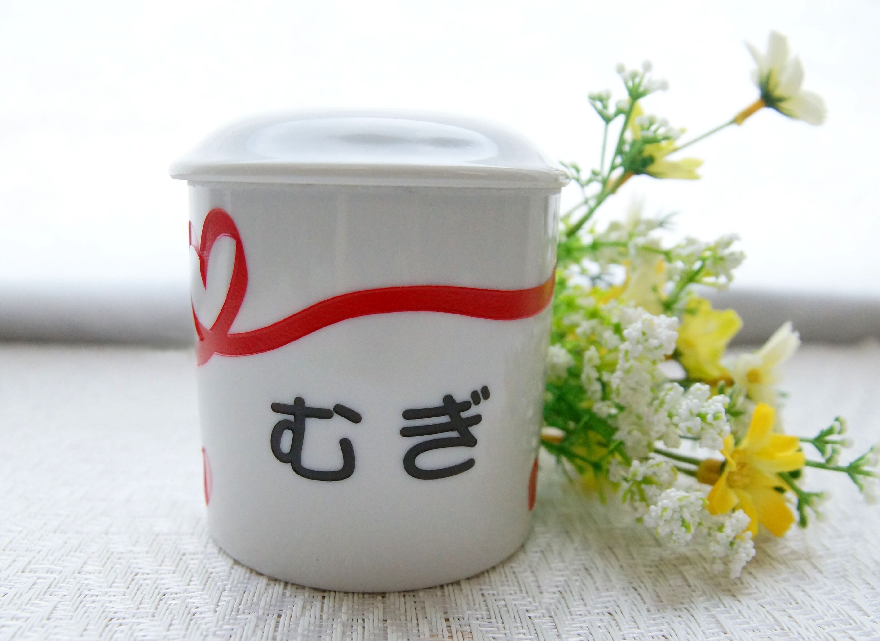 名前&シルエット入り オーダーメイド ハート&りぼん柄ポット【ポット+刻印+巾着セット】(送料無料)