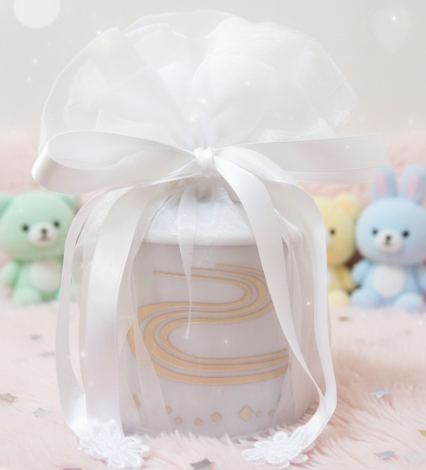 白いリボンを結ぶと、ふんわりとした優しい雰囲気が漂います。