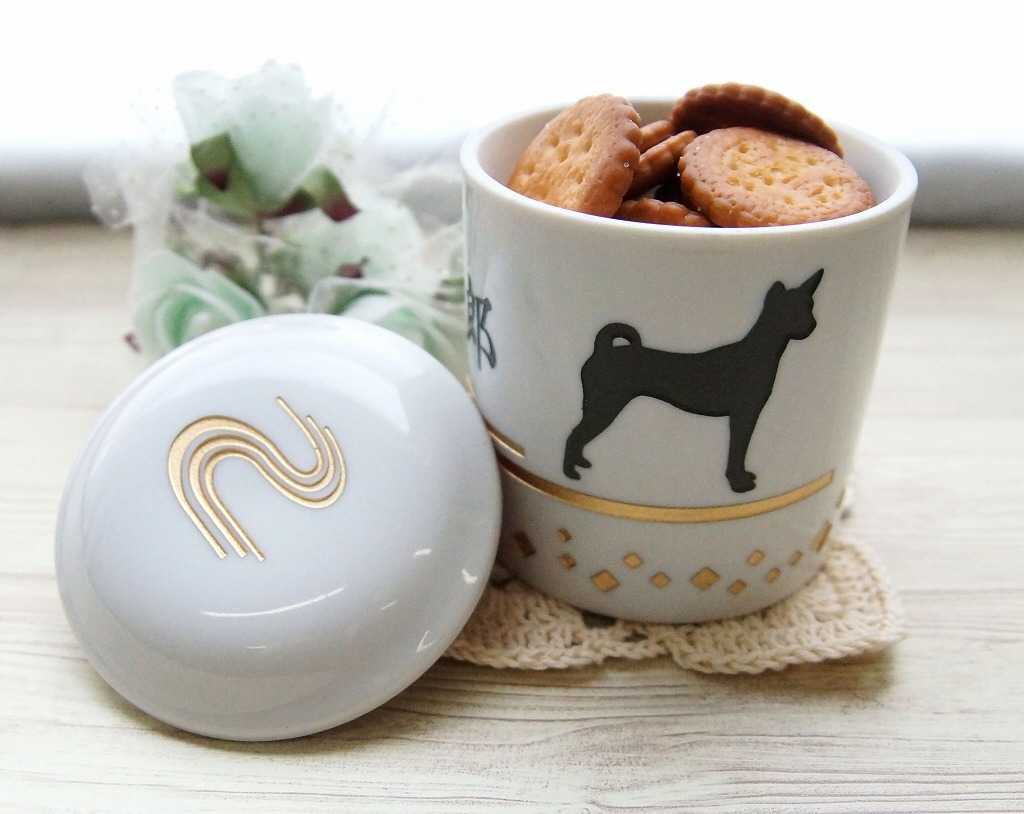 「波と星柄ポット」は、おやつや首輪、お手入れ用品、お気に入りのおもちゃなどを入れるのにぴったりな陶器のポットです。